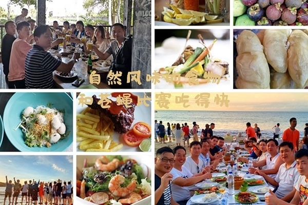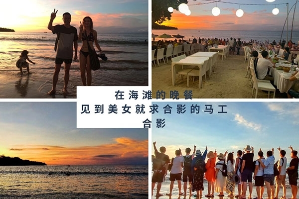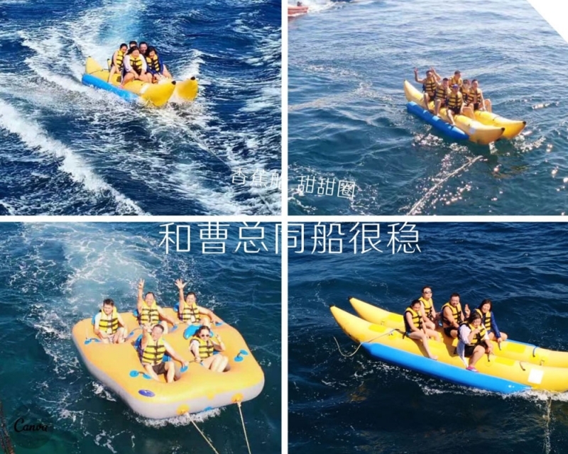 半小時后,我們首先到達了海中間由兩艘游輪搭建的漂浮“海上游玩基地”,除了“香蕉船”“甜甜圈”和“浮潛”這些項目,最有意思的是“跳海”,作為非專業隊員,大家入水姿勢各異,激起巨大的浪花。遺憾的是,“女神”曹總并沒有參與“跳?!?,估計她是為大家著想,怕入水海平面升高2米,淹沒“基地”,多年以后,我還是要感謝曹總的“不淹之恩”,讓我依然可以坐在在夕陽下回憶往昔。