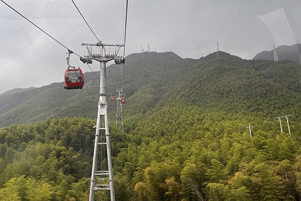 經過2個小時的車程,我們到達山腳下,但是又該怎么穿過群山,到達云端?答案就在下面,索道帶我們一步步接近秋空。這是一個2.3公里長的路程,43度至大傾角,落差有754米。坐在吊廂,一路領略那綠油蔥蔥。20分鐘的空中索道旅途,“↗→↘”,這就是我們經過的姿勢,由下而上、由仰到俯,過癮!!!!!
